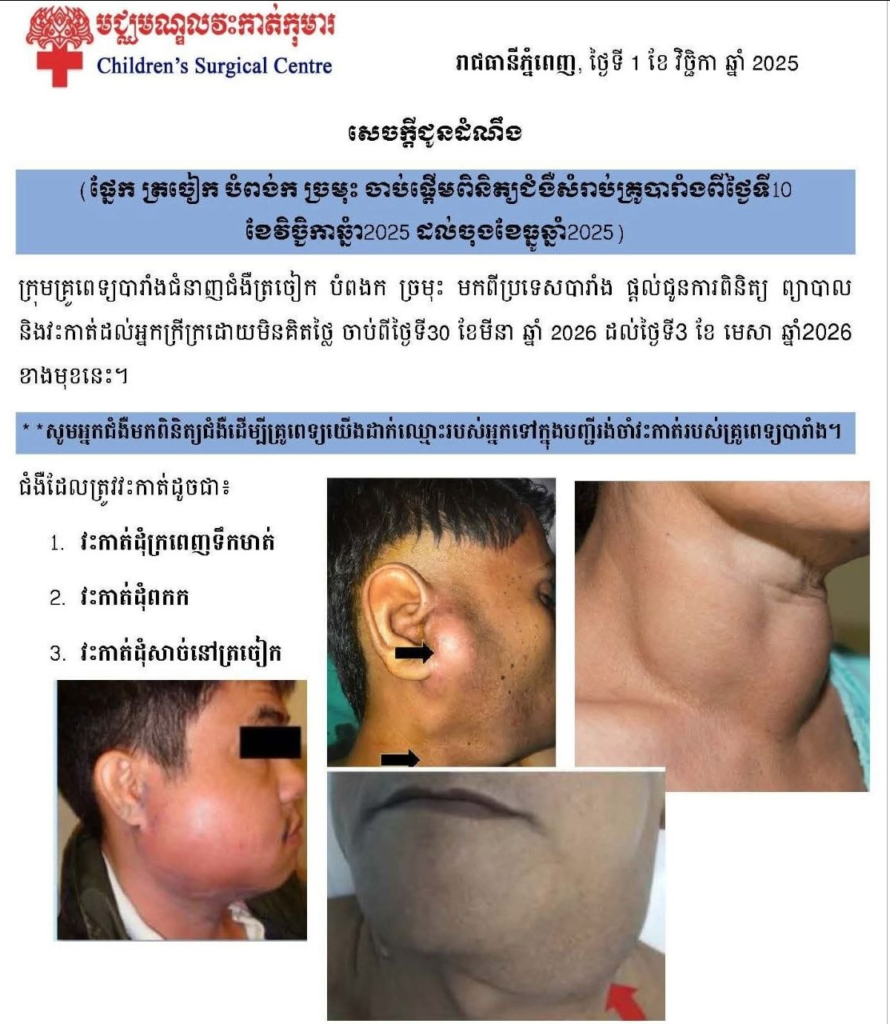 មជ្ឈមណ្ឌលវះកាត់កុមារ ហៅ ពេទ្យគៀនឃ្លាំង បានសហការជាមួយក្រុមគ្រូពេទ្យមកពីប្រទេសបារាំងជំនាញ ជំងឺ ច្រមុះ ត្រចៀក ផ្តល់ជូនការពិនិត្យ ព្យាបាល និងវះកាត់ដោយឥតគិតថ្លៃចំពោះអ្នកក្រីក្រ ចាប់ពីថ្ងៃទី30 ខែមីនា ឆ្នាំ 2026 ដល់ថ្ងៃទី3 ខែ មេសា ឆ្នាំ2026 ខាងមុខនេះ។