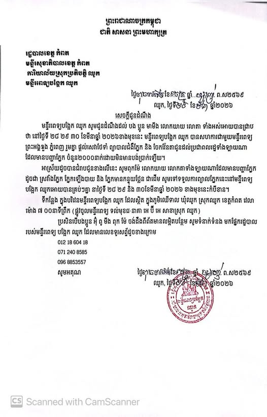អាស្រ័យដូចបានជម្រាបជូនដំណឹងខាងលើសូម បងប្អូនប្រជាពលរដ្ឋ លោកយាយលោកតា ដែលមានបញ្ហាភ្នែក អញ្ជើញមកទទួលសេវាពិនិត្យ ព្យាបាល និងបើកវ៉ែនតាកុំបីខាន។